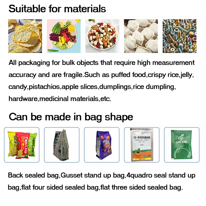 يمكن لآلات التغليف العمودية تعبئة المساحيق والحبيبات والوجبات الخفيفة والحبوب وأجزاء الأجهزة والمكونات الصناعية الصغيرة.